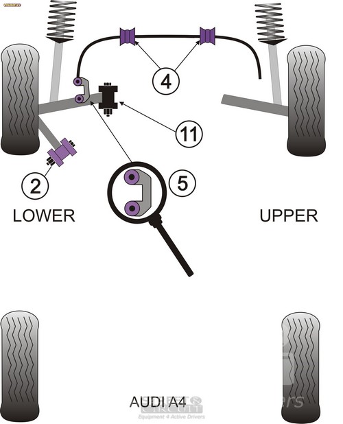 Front Silentblock barra estabilizadora 25mm PACK COMPLETO PARA EL VEHICULO DE 2 Unidades Numero en el diagrama: 4 Marca: AUDI Modelo: A6 (2002 - 2005) Powerflex produce casquillos y silent-blocks de poliuretano diseñados para incrementar la estabilidad en todas las unionenes articuladas, ayudando considerablemente a estabilizar la geometría de la suspensión durante las curvas, en frenadas y en aceleraciones.