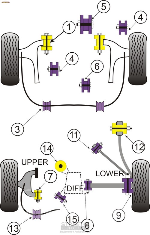 Powerflex produce casquillos y silent-blocks de poliuretano diseñados para incrementar la estabilidad en todas las unionenes articuladas, ayudando considerablemente a estabilizar la geometría de la suspensión durante las curvas, en frenadas y en aceleraciones. Los silent-blocks de Powerflex están fabricados con poliuretano. El poliuretano es un material plástico cuyas propiedades técnicas lo hacen muy adecuado para aquellos componentes sometidos a grandes esfuerzos. Otra gran ventaja es que no necesitan mantenimiento ni lubricación. Los silent-blocks originales están fabricados con un compuesto de caucho que se deteriora con el tiempo, ofreciendo cada vez menos control sobre la integridad geométrica de la suspensión. Debido a ello, los neumáticos también se desgastan con mayor rapidez y la conducción se convierte poco precisa, sobretodo al frenar o al acelerar. Gracias a este material y a la calidad de Powerflex, también ha sido posible reducir un problema común en las suspensiones como es el ruido.
