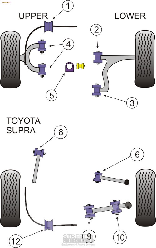 Rear Silentblock barra estabilizadora 22mm PACK COMPLETO PARA EL VEHICULO DE 2 Unidades Numero en el diagrama: 12 Marca: TOYOTA Modelo: Supra 4 JZA80 (1993-2002) Powerflex produce casquillos y silent-blocks de poliuretano diseñados para incrementar la estabilidad en todas las unionenes articuladas, ayudando considerablemente a estabilizar la geometría de la suspensión durante las curvas, en frenadas y en aceleraciones.