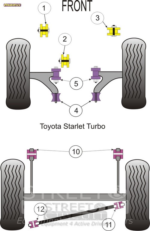 Rear Beam Mounting Bush PACK COMPLETO PARA EL VEHICULO DE 2 Unidades Numero en el diagrama: 1 Marca: TOYOTA Modelo: Starlet/Glanza Turbo EP82 & EP91 Powerflex produce casquillos y silent-blocks de poliuretano diseñados para incrementar la estabilidad en todas las unionenes articuladas, ayudando considerablemente a estabilizar la geometría de la suspensión durante las curvas, en frenadas y en aceleraciones.