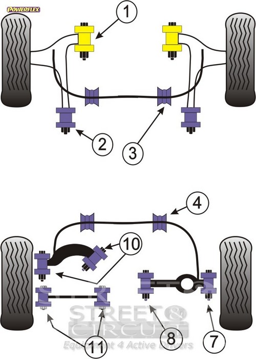Powerflex produce casquillos y silent-blocks de poliuretano diseñados para incrementar la estabilidad en todas las unionenes articuladas, ayudando considerablemente a estabilizar la geometría de la suspensión durante las curvas, en frenadas y en aceleraciones. Los silent-blocks de Powerflex están fabricados con poliuretano. El poliuretano es un material plástico cuyas propiedades técnicas lo hacen muy adecuado para aquellos componentes sometidos a grandes esfuerzos. Otra gran ventaja es que no necesitan mantenimiento ni lubricación. Los silent-blocks originales están fabricados con un compuesto de caucho que se deteriora con el tiempo, ofreciendo cada vez menos control sobre la integridad geométrica de la suspensión. Debido a ello, los neumáticos también se desgastan con mayor rapidez y la conducción se convierte poco precisa, sobretodo al frenar o al acelerar. Gracias a este material y a la calidad de Powerflex, también ha sido posible reducir un problema común en las suspensiones como es el ruido.