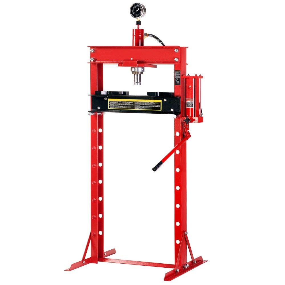 Prensa hidráulica de 20 toneladas con manómetro, mesa ajustable en altura y pistón deslizante a lo largo de la viga superior. Permite realizar trabajos con efectividad y precisión.