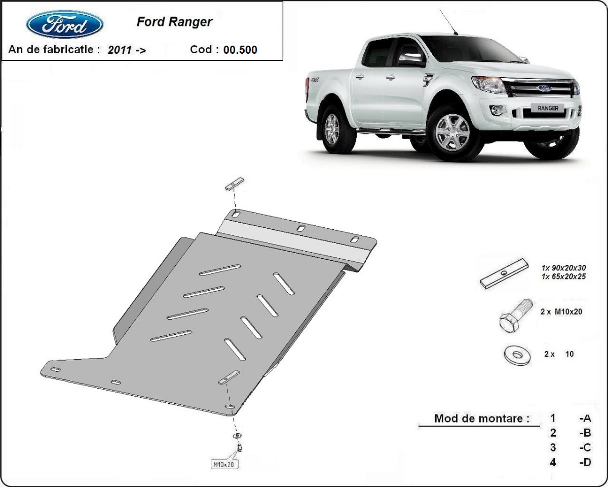Protector de Acero para caja de cambios del Ford Ranger Año: 2011 - 2020 Motor: Todas las motorizaciones Caja cambio: Grosor: 3mm Agujero para aceite: Sin hueco para el tapon de aceite. Protege: caja de cambios Descripcion: Protecciones de acero o aluminio para el motor y la caja de cambios.