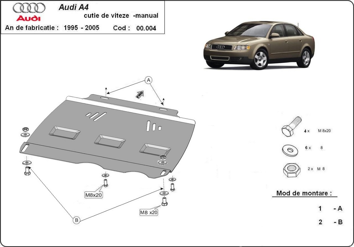 Protector de Acero para caja de cambios manual Audi A4 B6 Año: 2000 - 2005 Motor: Todas las motorizaciones Caja cambio: manual Grosor: 2mm Agujero para aceite: Sin hueco para el tapon de aceite. Protege: caja de cambios Descripcion: Protecciones de acero o aluminio para el motor y la caja de cambios.