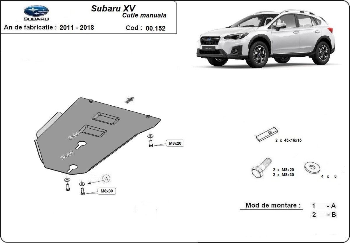 Protector de Acero para caja de cambios manual Subaru XV Año: 2011 - 2017 Motor: Todas las motorizaciones Caja cambio: manual Grosor: 2mm Agujero para aceite: Sin hueco para el tapon de aceite. Protege: caja de cambios Descripcion: Protecciones de acero o aluminio para el motor y la caja de cambios.