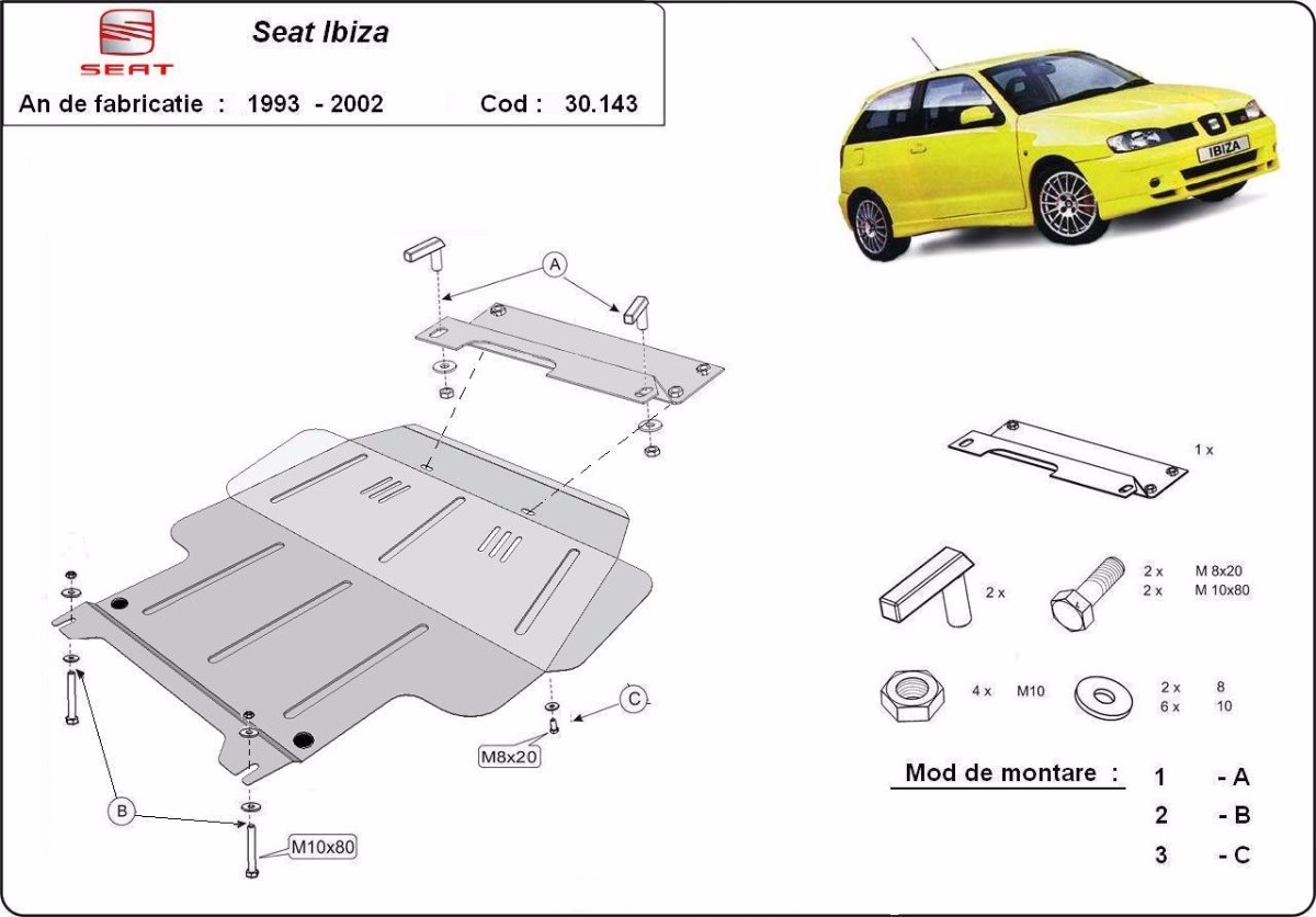 Protector de cárter de Acero para Seat Ibiza Año: 1993 - 2002 Motor: 1.0 2.0 Caja cambio: Grosor: 2mm Agujero para aceite: Sin hueco para el tapon de aceite. Protege: motor, caja de cambios, radiador, parachoques delantero Descripcion: Protecciones de acero o aluminio para el motor y la caja de cambios.