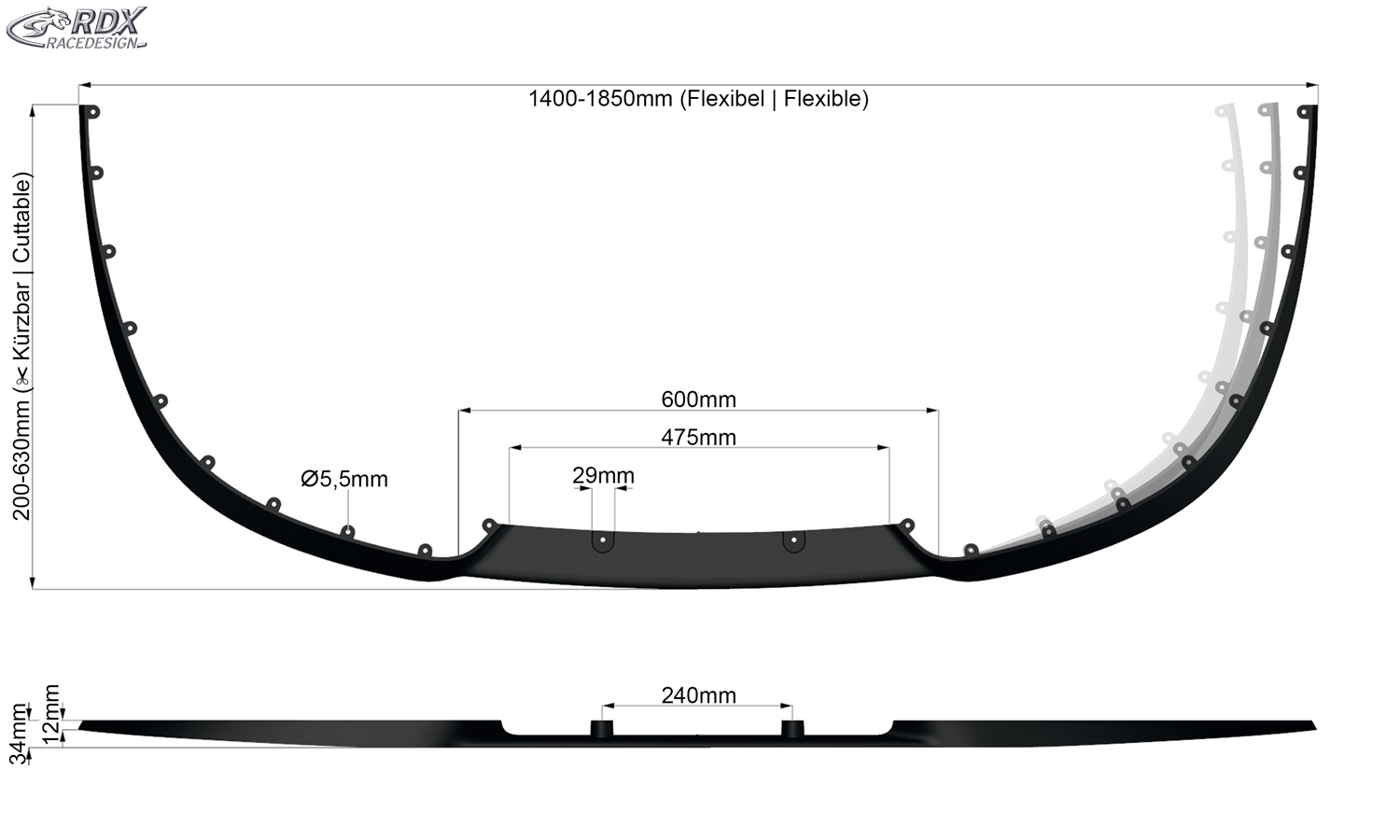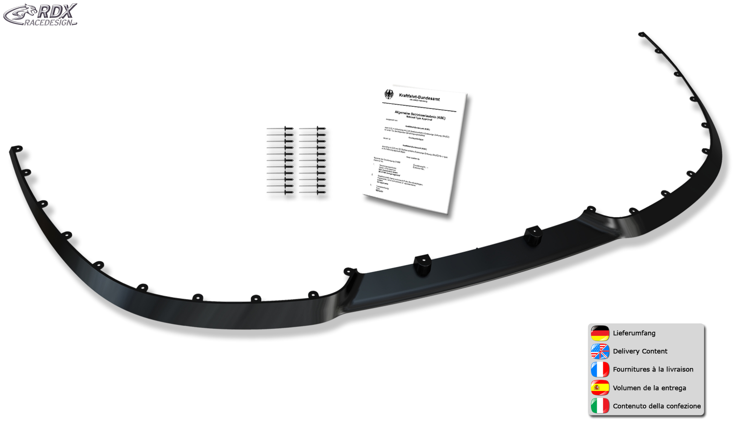 RDX Spoiler Universal CUP2.0 Front Splitter El labio de spoiler universal CUP2.0 es un producto de calidad innovador de RDX, Made in Germany. Este elegante labio de alerón está hecho de plástico PUR altamente flexible (PUR-RIM) con propiedades de alta flexibilidad. El labio del alerón universal CUP2.0 está listo para el usuario en negro, por lo que no hay costes adicionales para pintar. El labio del alerón es adecuado para pintar.