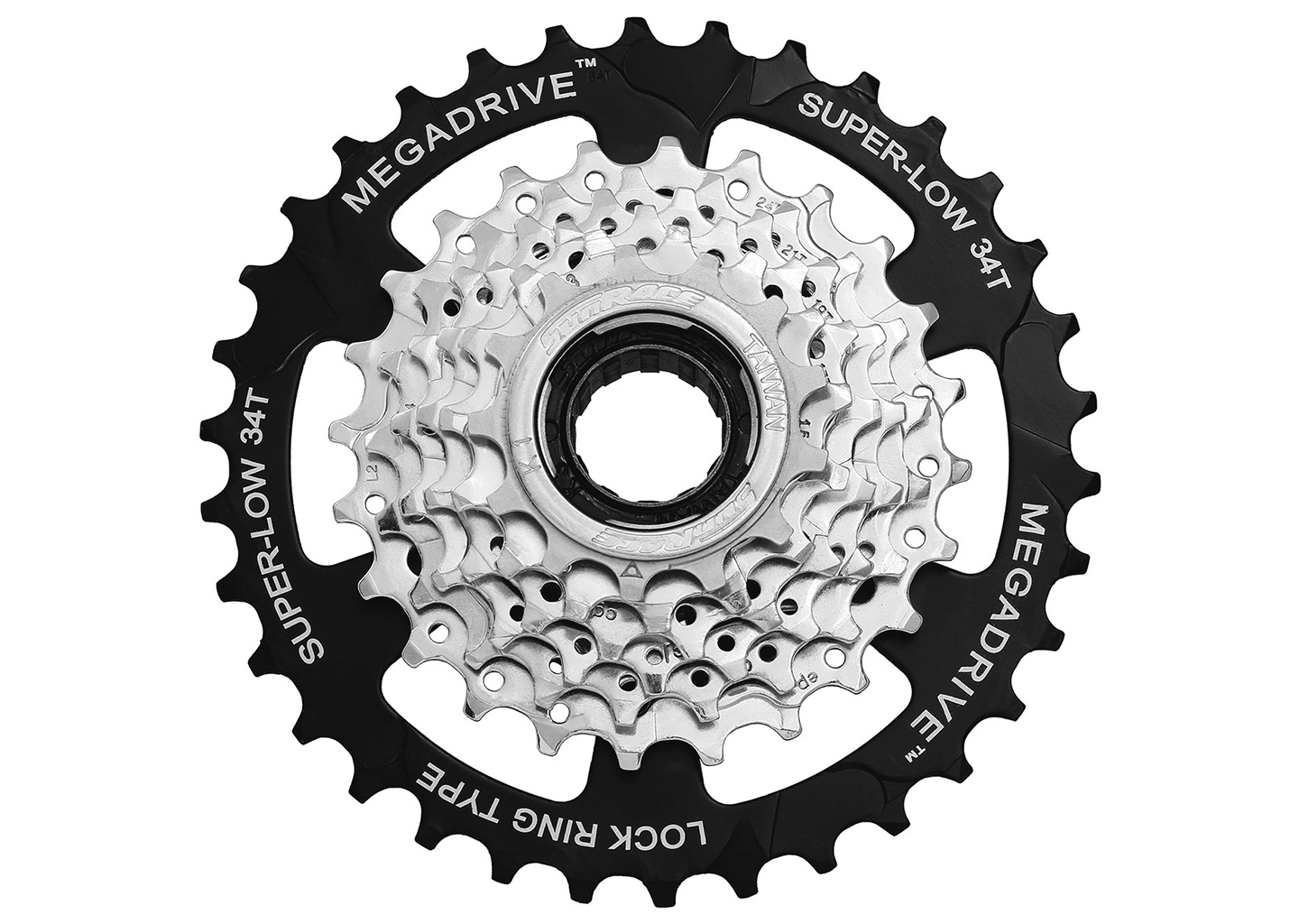 SunRace, Threaded cassette sprocket, MFM4S, 7-speed, MEGADRIVE, 13-34 teeth (13-15-17-19-21-24-34), ind. packed, colour: zinc
