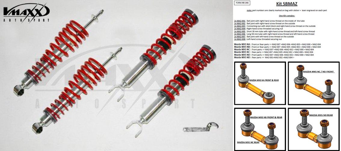 Kit suspension regulable altura V-Maxx MAZDA MX5 1.8 / 2.0 / Roadster / Coupé * = para bajar mas de 40 mm utilizar pernos de conexión especiales del estabilizador: SBMAZ Año:05 > Tipo: NC Rebaja Delnt.: 35 > 65 Rebaja Detr.: 35 > 65 Homologacion:TUV