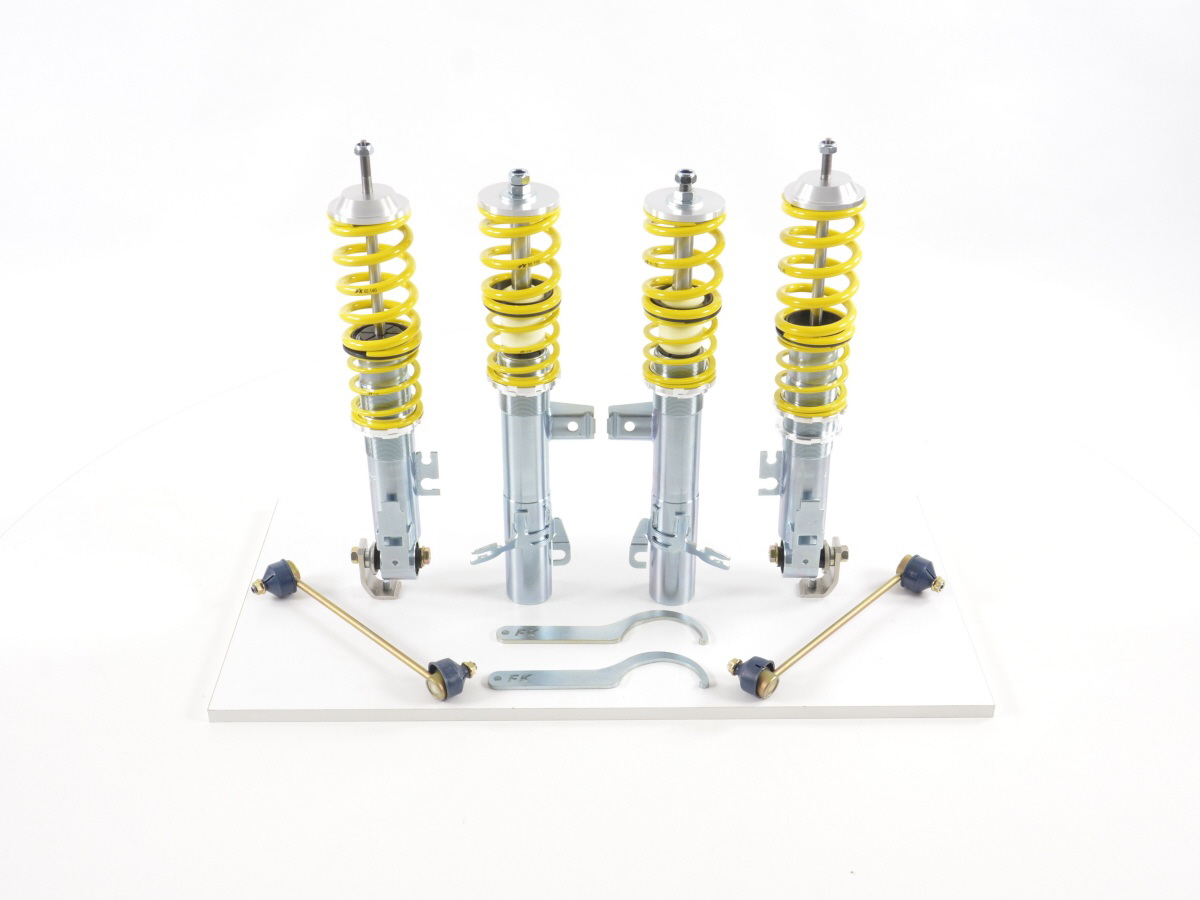 Kit coilover FK, suspensión deportiva regulable en altura para Mini Cooper año modelo 2006 a 2014 incluido certificado de piezas según §19.3 Bajando aprox.25 a 55 mm Material: acero galvanizado deportivo, estrechamente coordinado altura regulable individualmente, incluida llave de gancho incluidas las barras de acoplamiento acortadas FKKSS13 Max. Carga del eje delantero 935 kg Max. Carga del eje trasero 810 kg el chasis para una conducción más divertida a bajo precio El tiempo de entrega puede ser de 7 dias según la disponibilidad Kit de suspensión roscada FK Mini Cooper Año 2006-2014 (AK-STREET) A un precio razonable, obtiene el modelo superior de FK como el comienzo ideal en el mundo del tuning. Los coilovers se pueden ajustar rápida y fácilmente con la ayuda de la llave de gancho suministrada. Dependiendo del vehículo, el rango de ajuste varía entre 25 y 80 mm. Los kits de coilover FK se han utilizado con éxito durante casi 25 años y son conocidos por su configuración de suspensión deportiva, la más alta calidad y una excelente relación precio-rendimiento. Materiales de primera clase, mano de obra perfecta y muy buena protección contra la corrosión le garantizan un placer de conducción prolongado con estos coilovers de alta calidad. A menos que se indique lo contrario, los coilovers están equipados con un certificado de piezas TÜV. El kit de coilover FK es la primera opción para todos los que quieran ajustar su vehículo; - ajuste de altura simple, continuo e individual en el rango de ajuste probado - coordinación deportiva apretada - calidad de primera clase para una larga vida útil - Más diversión al conducir gracias a un excelente comportamiento en las curvas. - Solución completa lista para su instalación - Amortiguador deportivo de calidad FK óptimamente coordinado - componentes de aluminio fabricados por CNC de alta calidad (parcialmente anodizados) - nuevo y en embalaje original - disponible inmediatamente Volumen de suministro: 1x kit de coilover FK con alcance de entrega específico del vehículo y llave de gancho 1x certificado de piezas según §19 / 3 para descargar 1x instrucciones de montaje