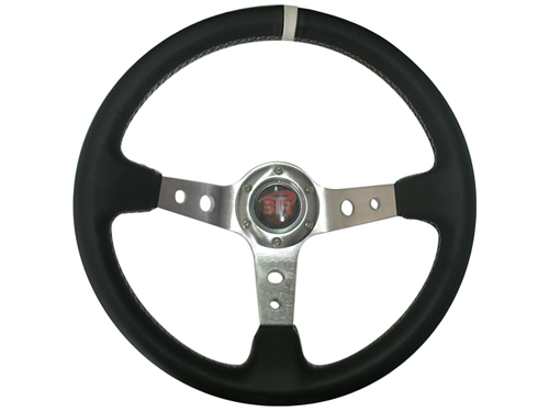 Volante WRC3 Piel lisa negra brazos color metal ribete blanco, costura blanca 350 mm de diámetro y 95 mm de desplazamiento.